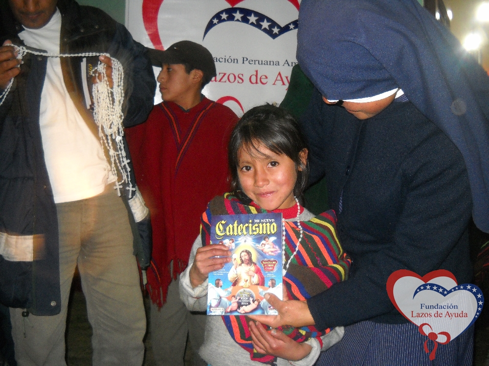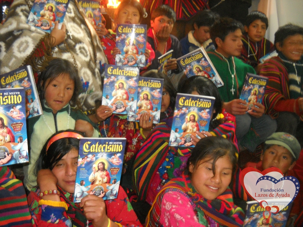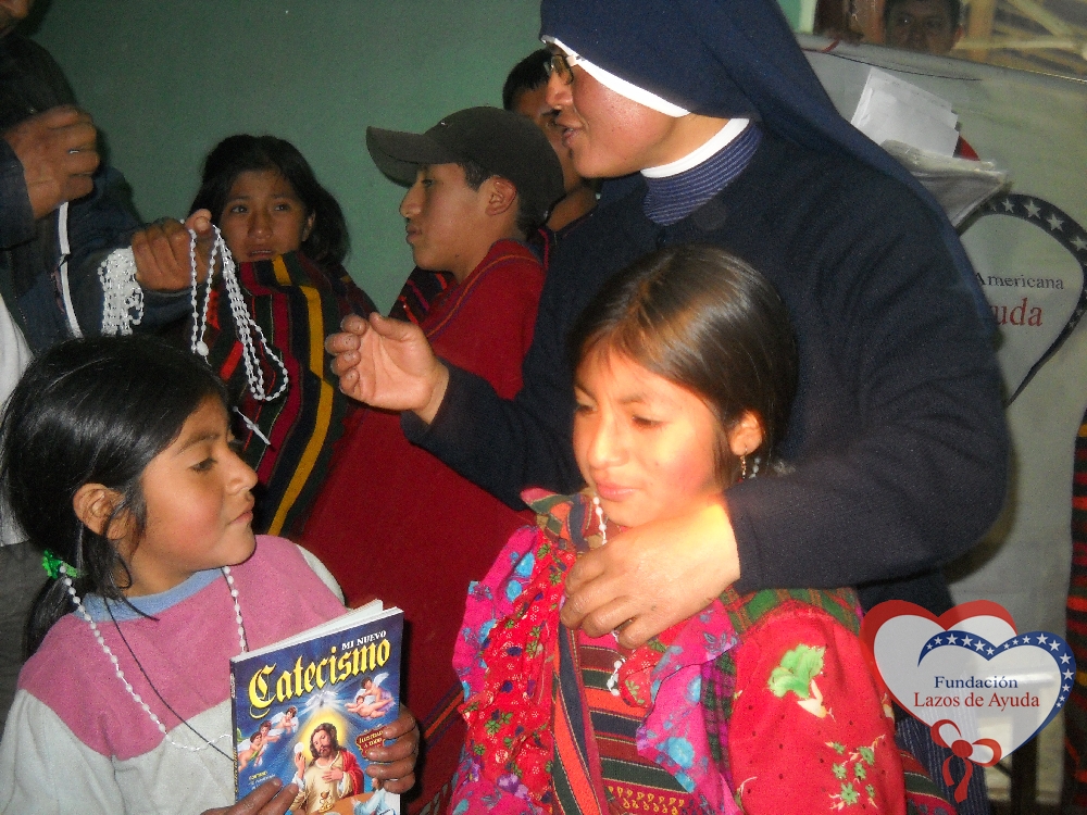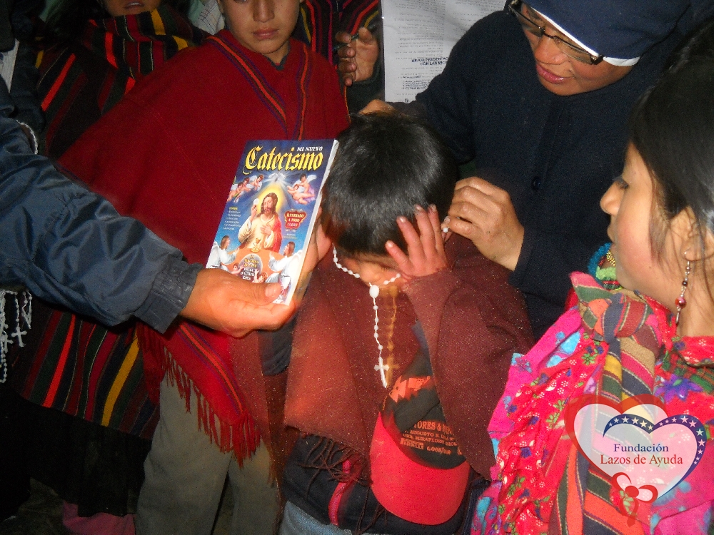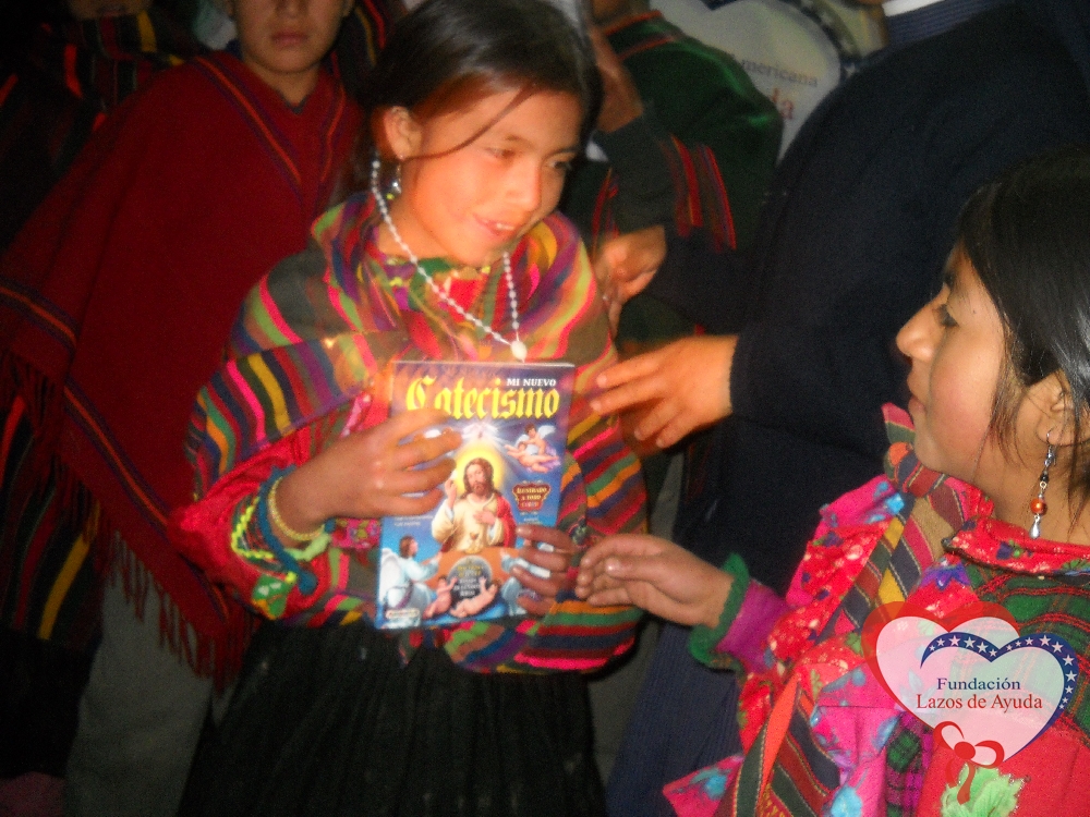 In coordination with the missionary mothers of the order “Jesus Verb and Victim”, they in such a sacrificed work traveling through each of the villages, accompanied us on long walks in such difficult terrains, crossing mountains and inclement weather with the only order to fulfill the mission emanated from the Almighty. Seeing the way to bring children to that light of Christ, trying to complement their religious education and catechesis, Lazos de Ayuda Foundation decided to make this donation where the children found fully illustrated catechisms containing the explanation of Christian doctrine.