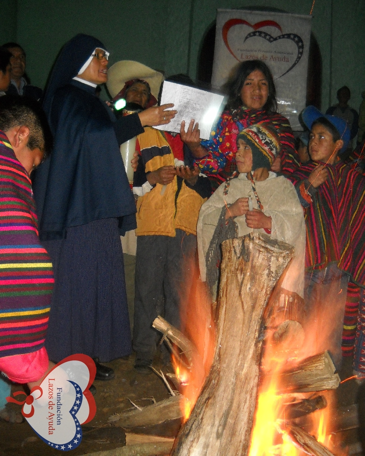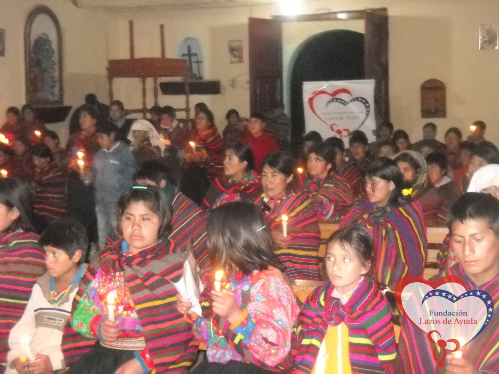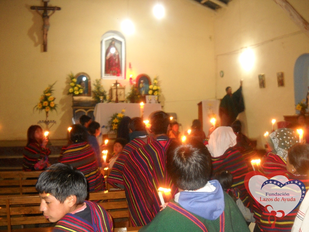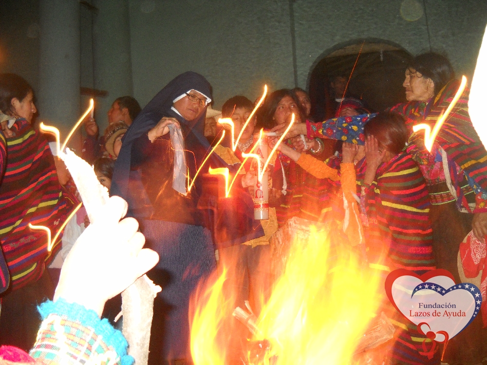 The locality of Uyurpampa with a difficult access, of around 6 hours of intense roads between precipices, dangerous abysses added that day the rain making our route more complicated. With a bonfire at the door of the church, the event was started for Easter, lighting candles and praying with the children. Symbolically, it was asked to burn all the sins that accompany our lives. Thus, they entered the beautiful temple, praying at that sublime moment to begin the liturgy celebrated by the mothers.