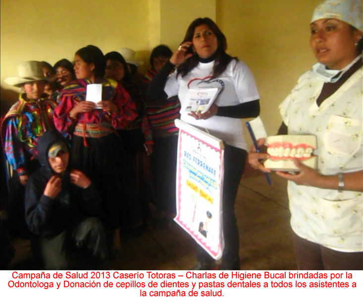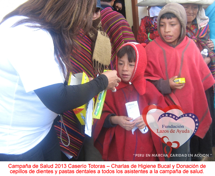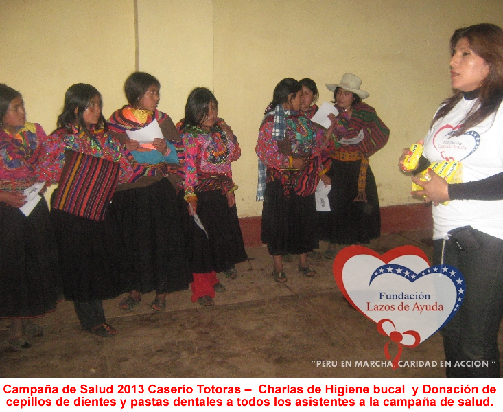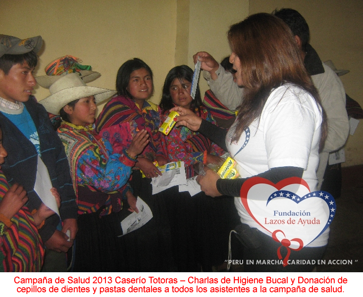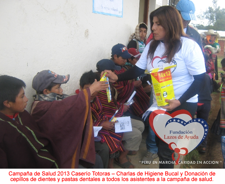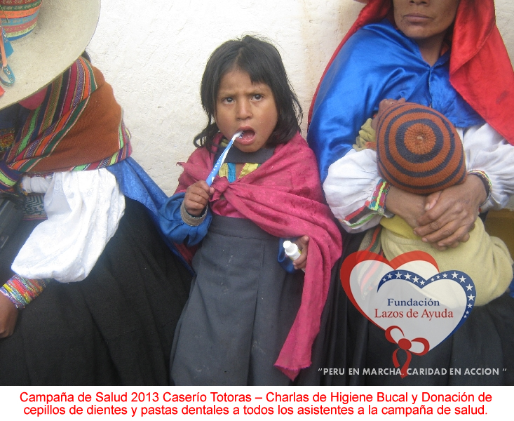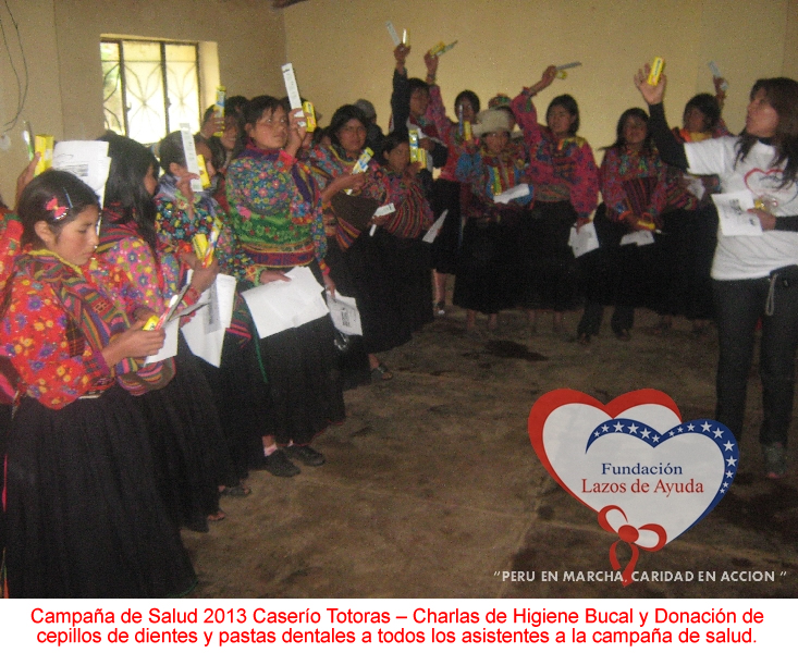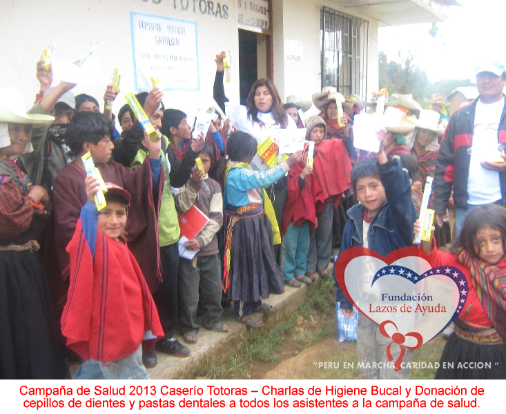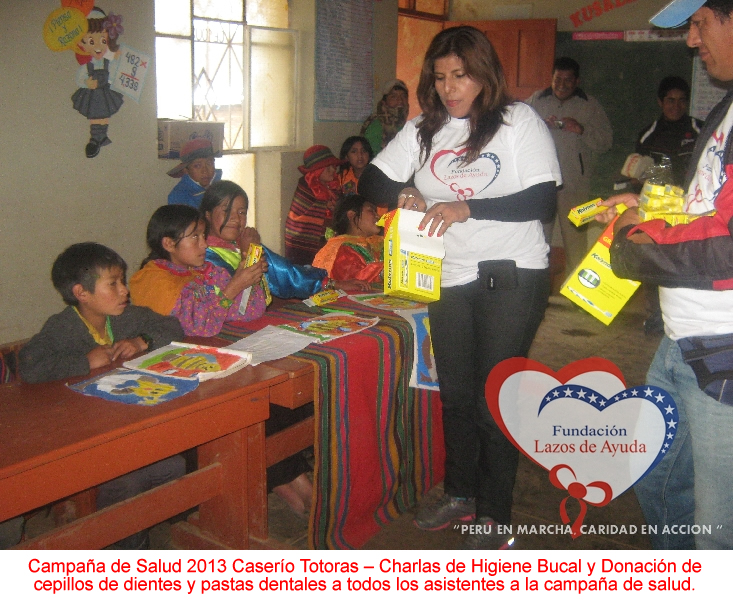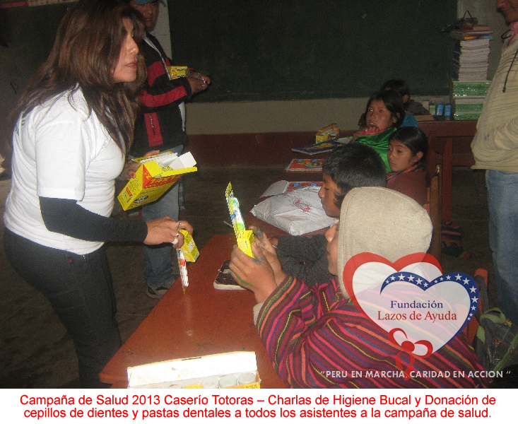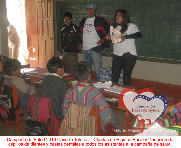 in a didactic way explain the benefits of wearing a correct oral hygiene, Dr. Libya made a demonstration of the use of toothbrush. In the same way a volunteer of Lazos de Ayuda, graduated Mg. Azucena del Pilar Jara Paredes, classroom by classroom at the school of the hamlet of Totoras, demonstrated the correct use of toothbrush and the importance and benefits of maintaining good hygiene. In the same way, explanatory educational brochures were distributed, toothbrushes and toothpastes were donated to all the children attending.