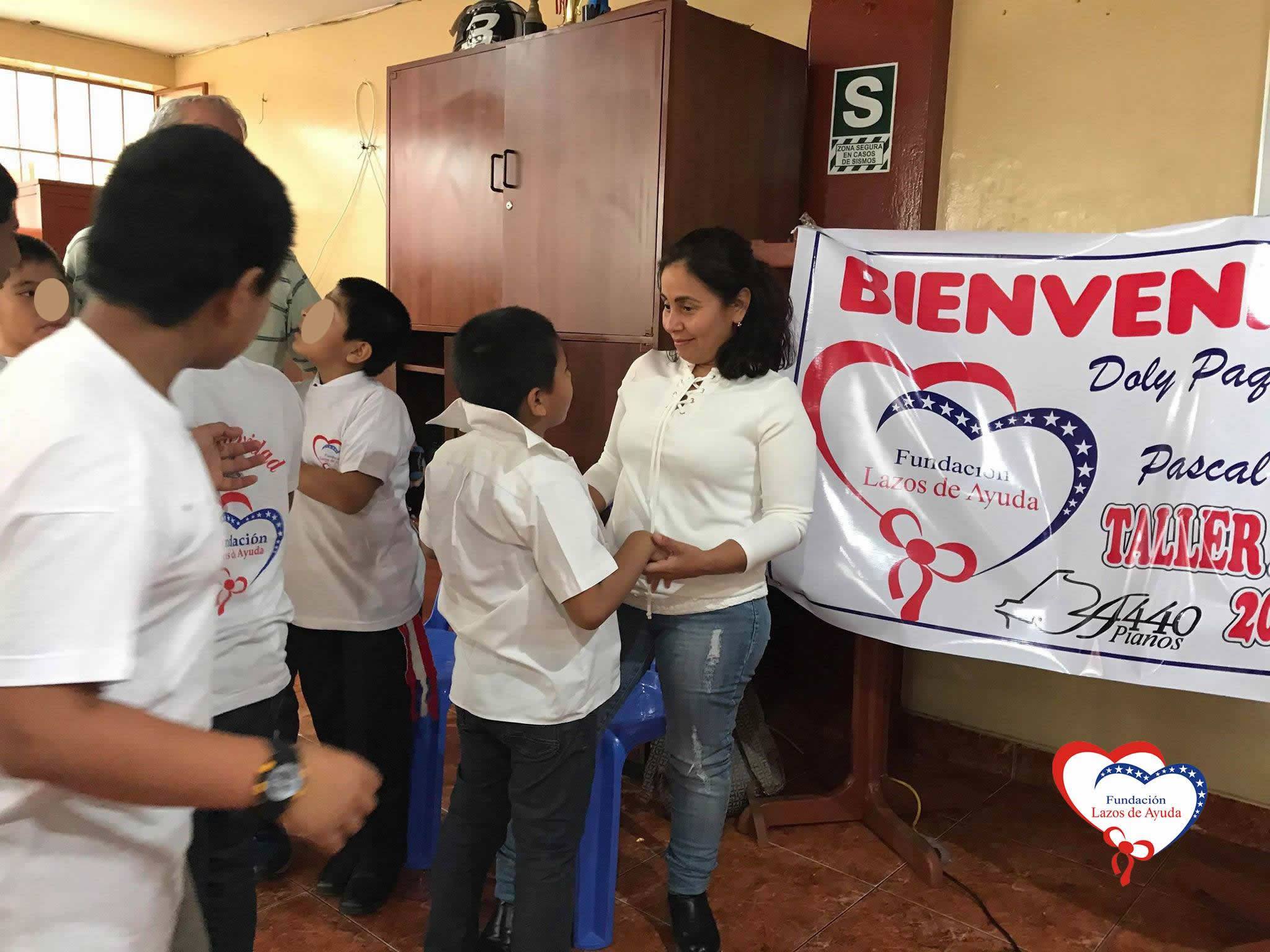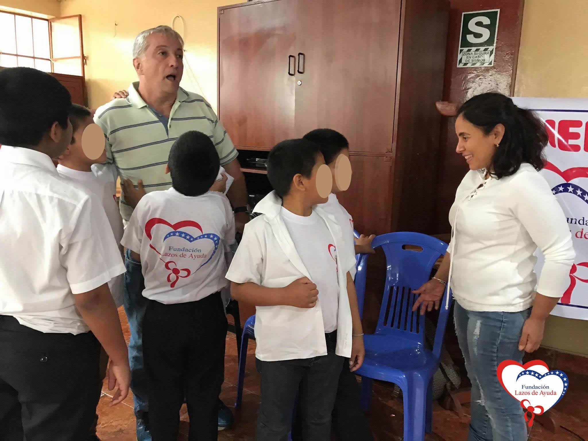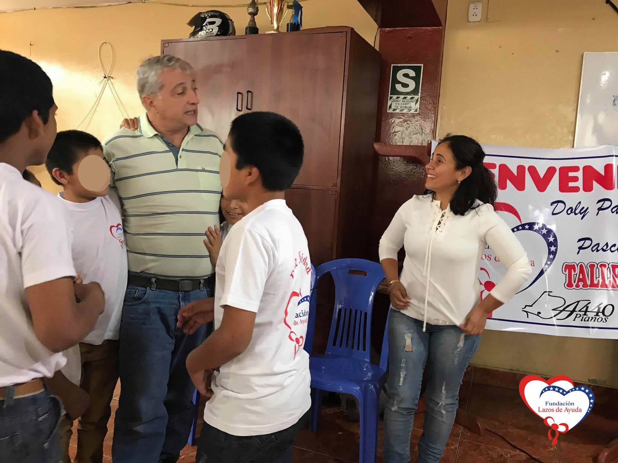 Lazos de Ayuda Foundation, represented by Mrs. Maritza Castro, the Silvia Jara volunteer and the music teacher Mario Frias Mundaca hired by the Foundation, offered an emotional welcome to Pascal Viellard and Dolly Paquita Vasquez. They arrived from Atlanta, United States, to visit this center where they provide care and therapy to children who came by abandonment, domestic violence, abuse of different types and other traumatic circumstances.